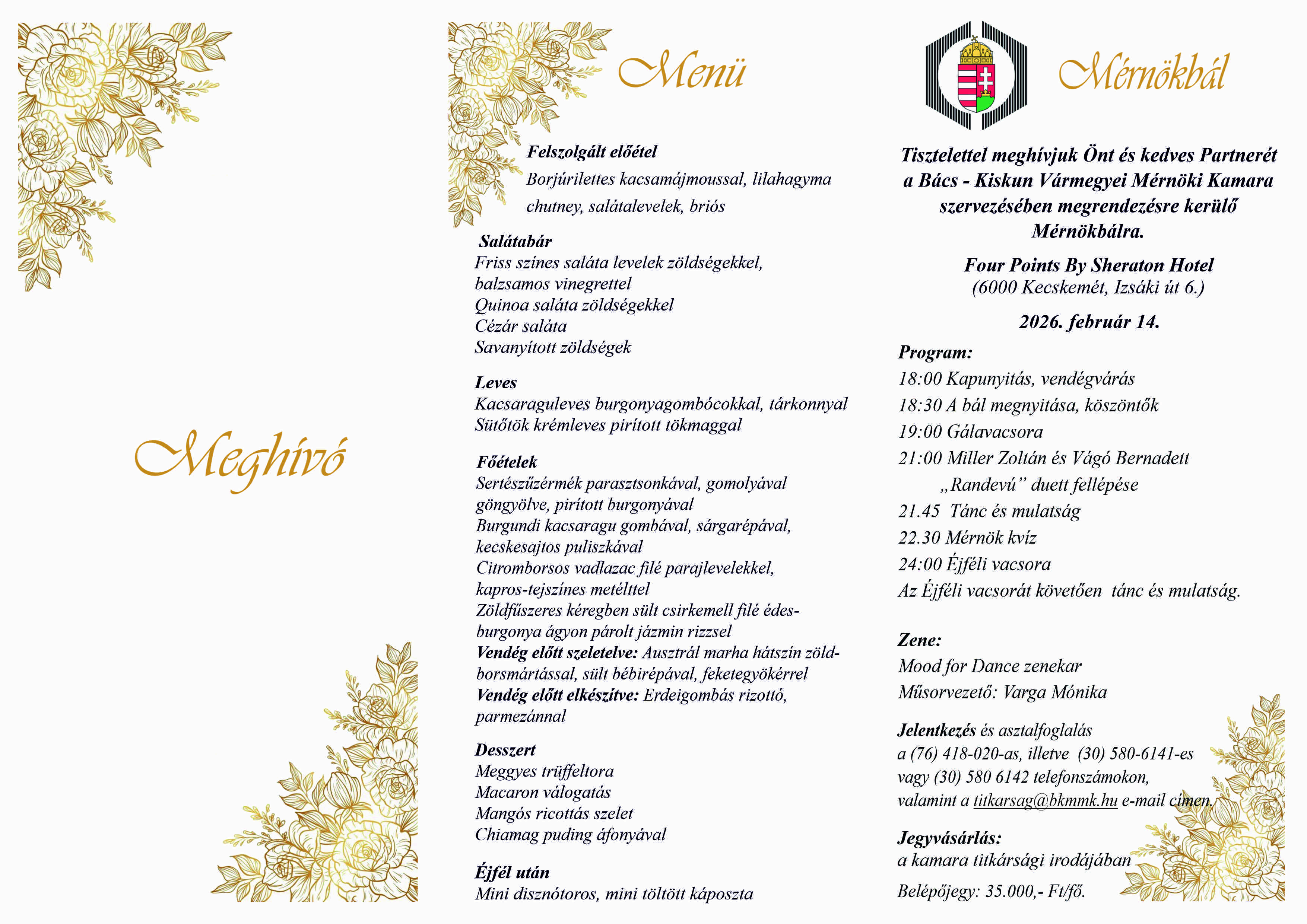 Szeretettel meghívjuk Önöket a Bács-Kiskun Vármegyei Mérnöki Kamara által 2026. február 14. napján megrendezendő Mérnökbálra.